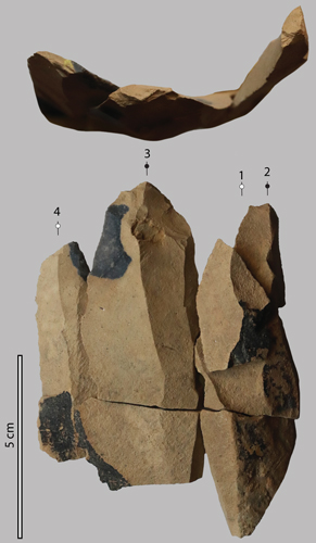 Remontage lithique d’une séquence de production laminaire sur face corticale. M. Langlais et M. Grubert, 2018.